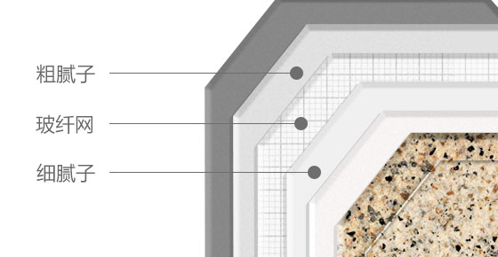 粗膩子復合玻纖網布用于基面整體找平,提高飾面整體平整度及柔韌性。